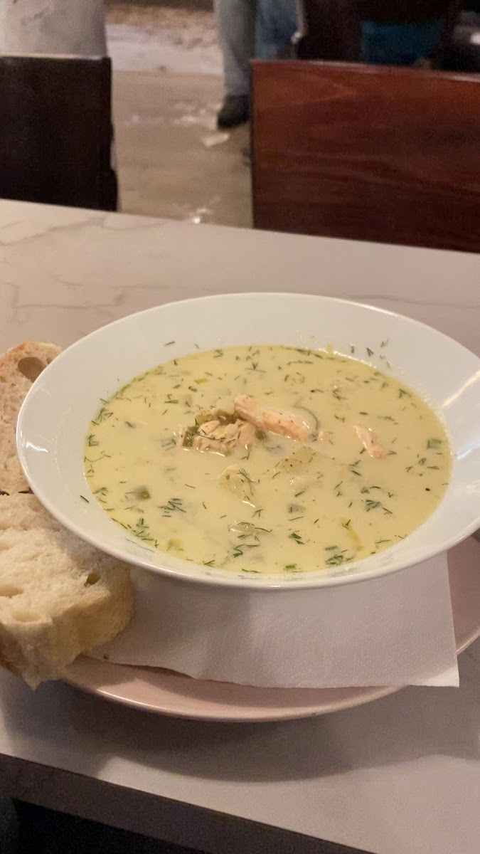 Their salmon soup was delicious! I could have it every single day. The soup was rather non creamy but had lots of tastes. They put a big chunk of salmon which was generous. The atmosphere is very cosy and I love that you can get water for free.